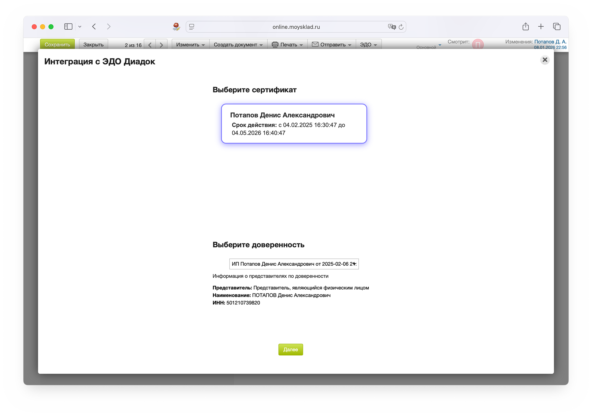 Позволяет быстро создавать и отправлять документы через Диадок в МоемСкладе
