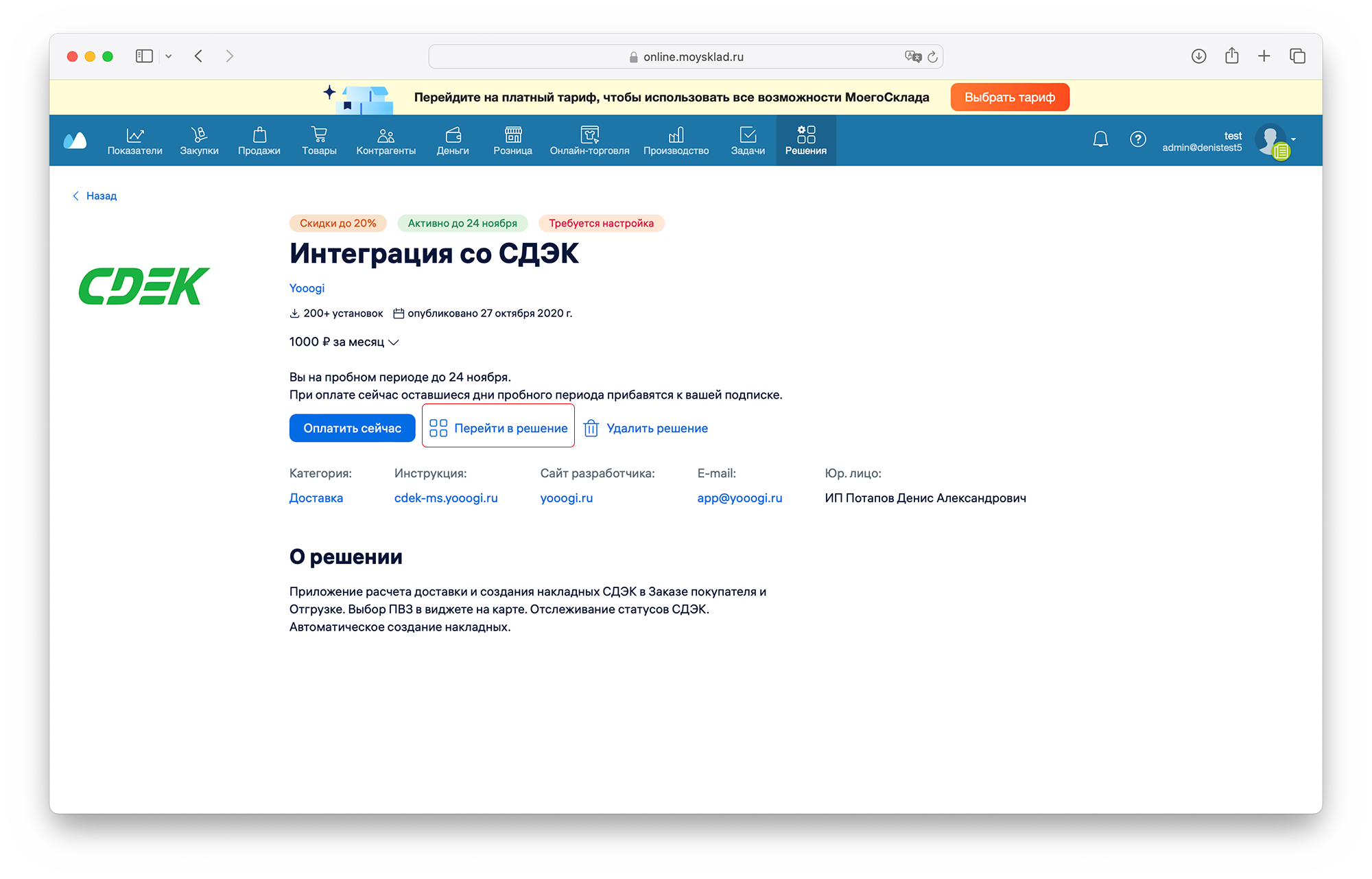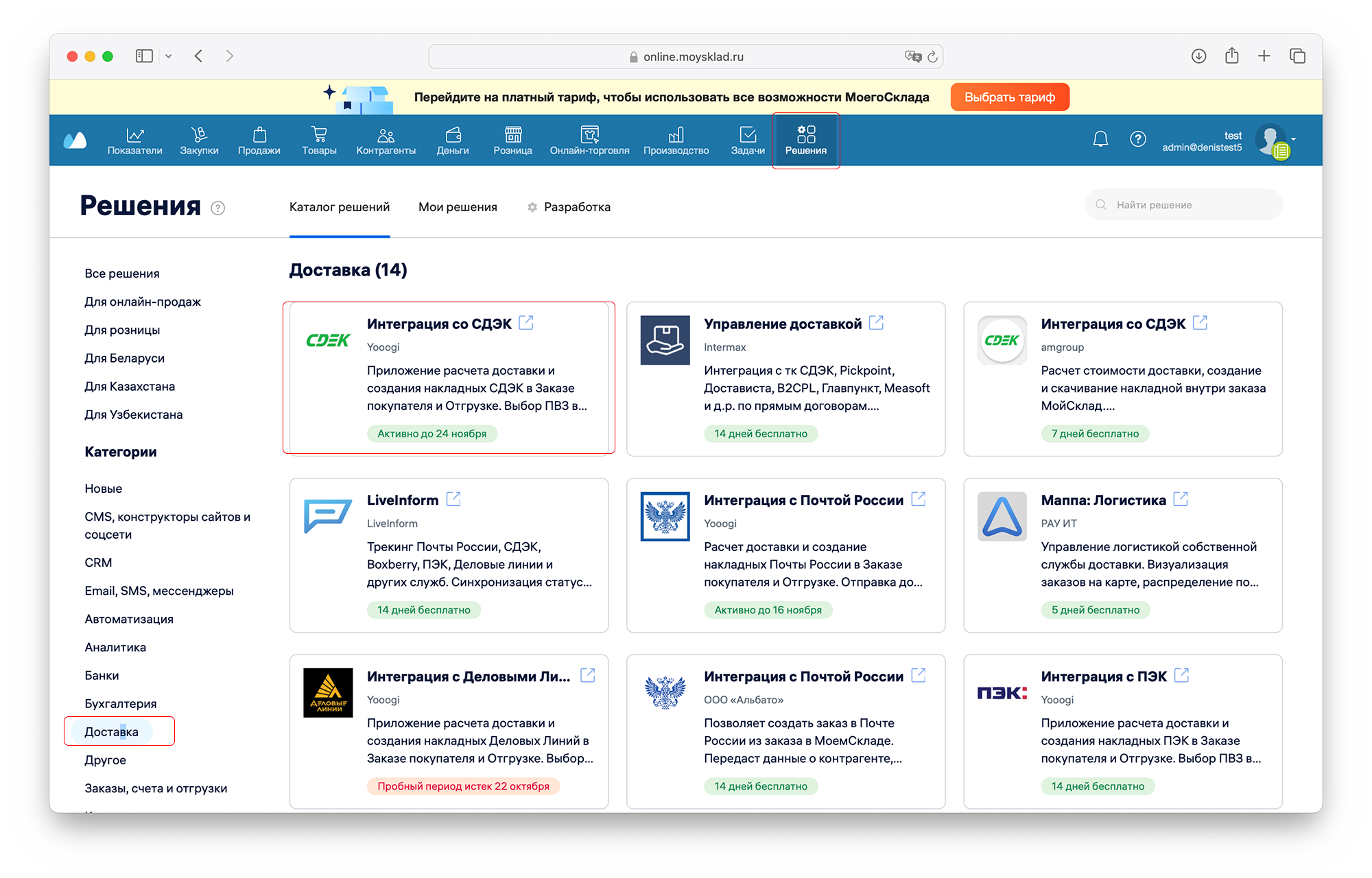 В открывшемся каталоге перейдите в карточку "Интеграция со СДЭК" (Yooogi)