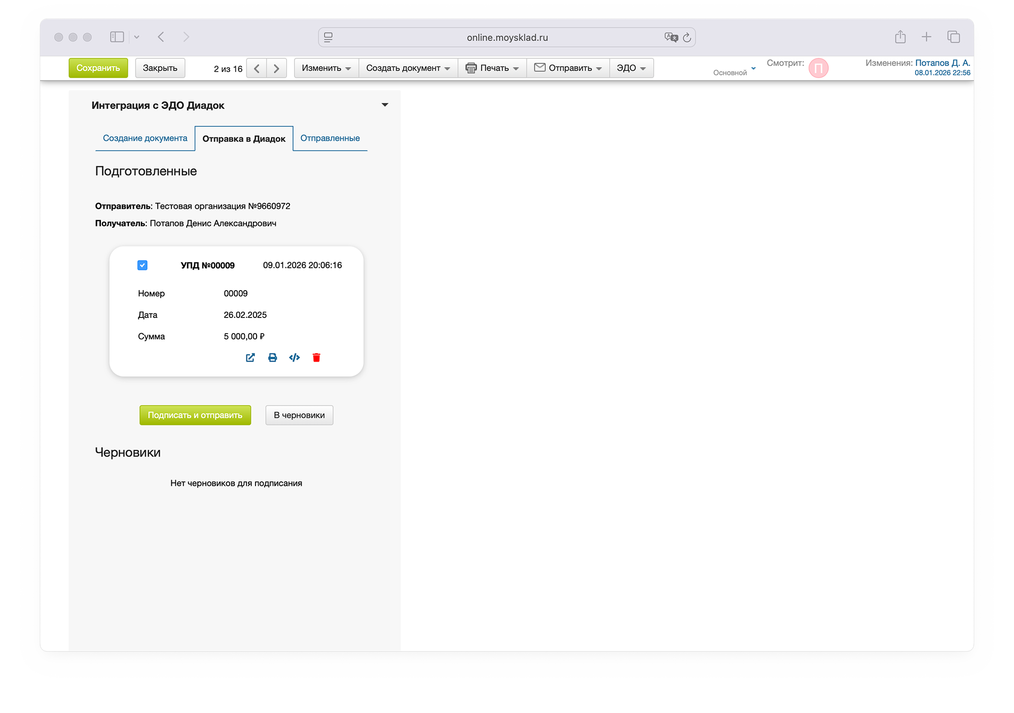 Позволяет быстро создавать и отправлять документы через Диадок в МоемСкладе