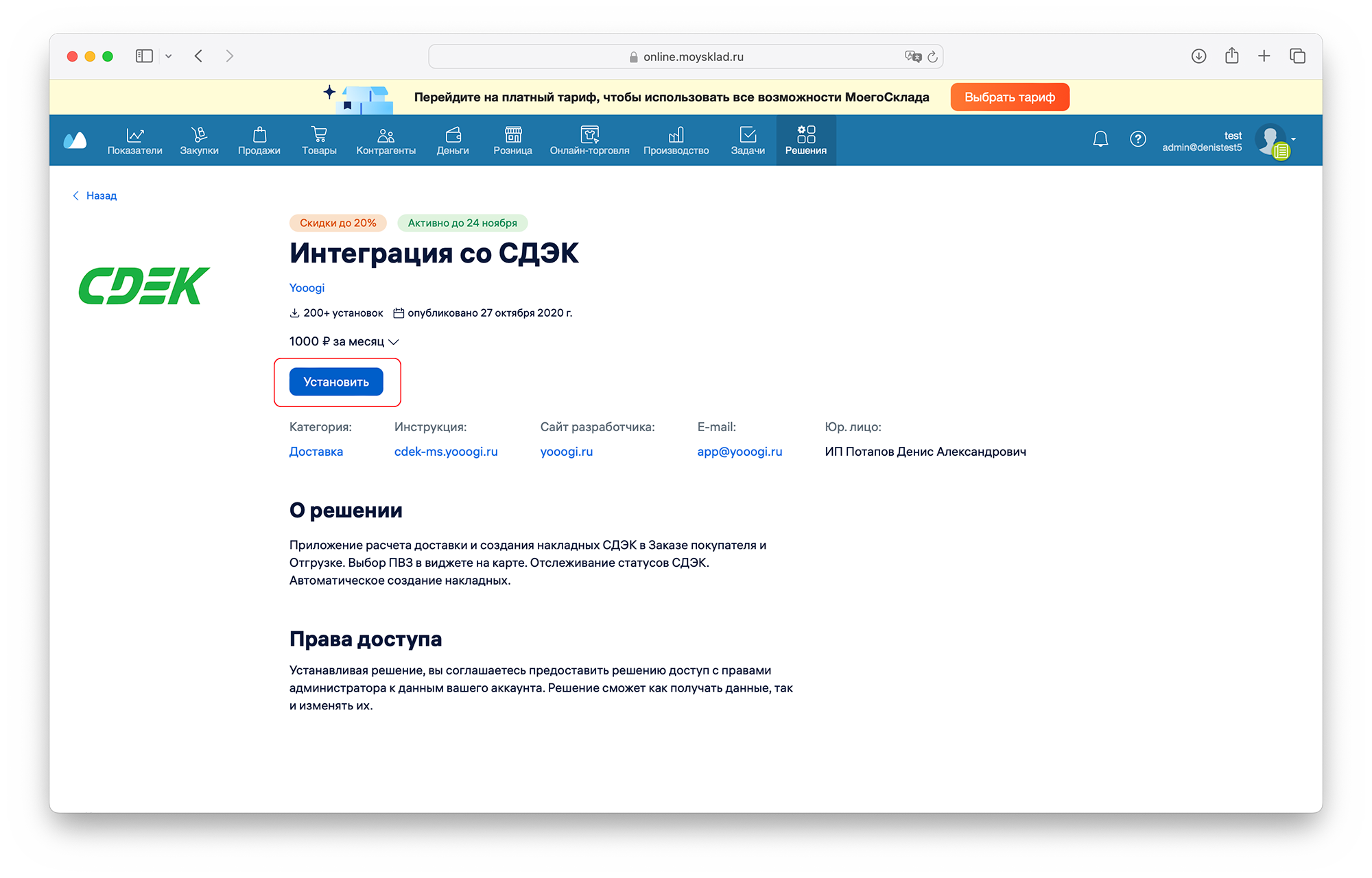 В открывшемся каталоге перейдите в карточку "Интеграция со СДЭК" (Yooogi)
